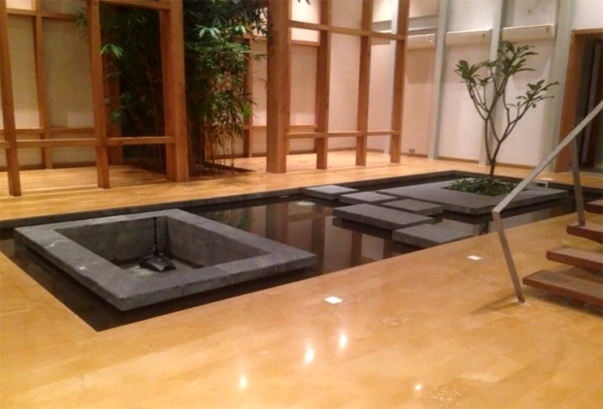 The interior design was an extension of the landscape, inspired by the riverbed, trees, plants and stones abutting the site. The furniture, floor finish, lighting, upholstery and planters were all inspired from nature and synced with each other to give a holistic feel.