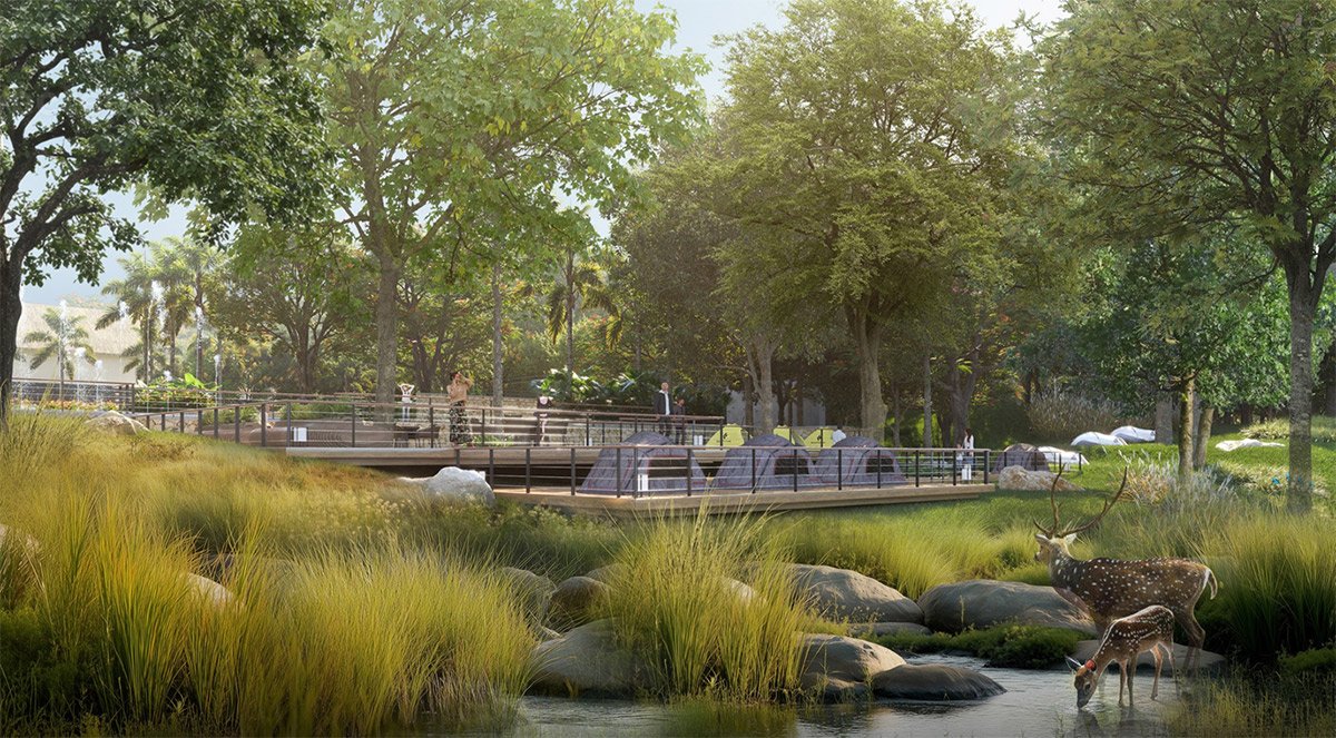 The recreational zones and landscape amenities extend across the length of this linear property, which already benefits from existing clusters of mature trees. Outdoor cabanas, decks, and camping zones cascade down the natural slope toward an active stream, creating a dynamic and immersive outdoor lifestyle.