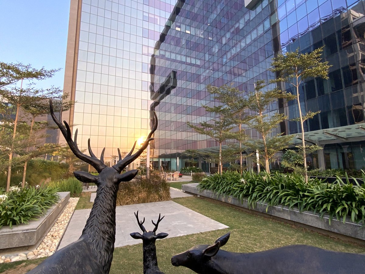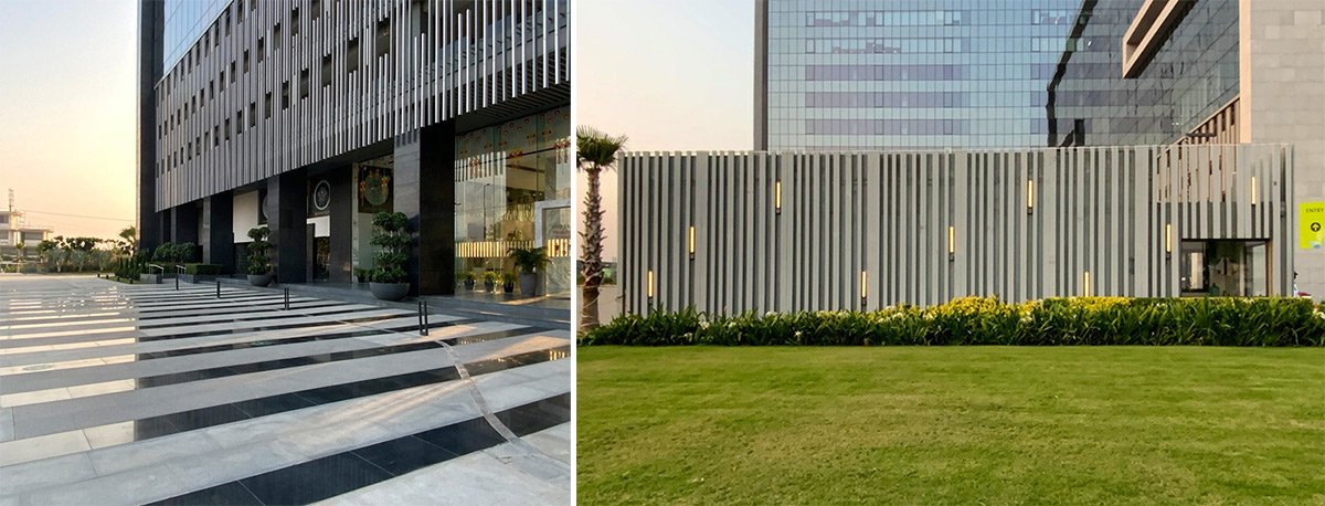 AIPL Business Club, Gurgaon, stands out from a large foreground plaza with its stark, crisp facade massing, interspersed with multiple terraces and landscaped decks, making it one of the most upmarket and contemporary workspaces in Gurgaon. The green glades on both sides of the corner plot add to its foreground depth, complemented by an articulate streetscape design along the abutting roads