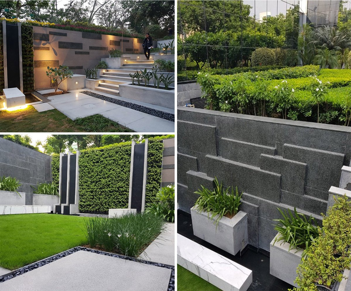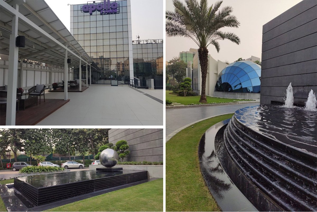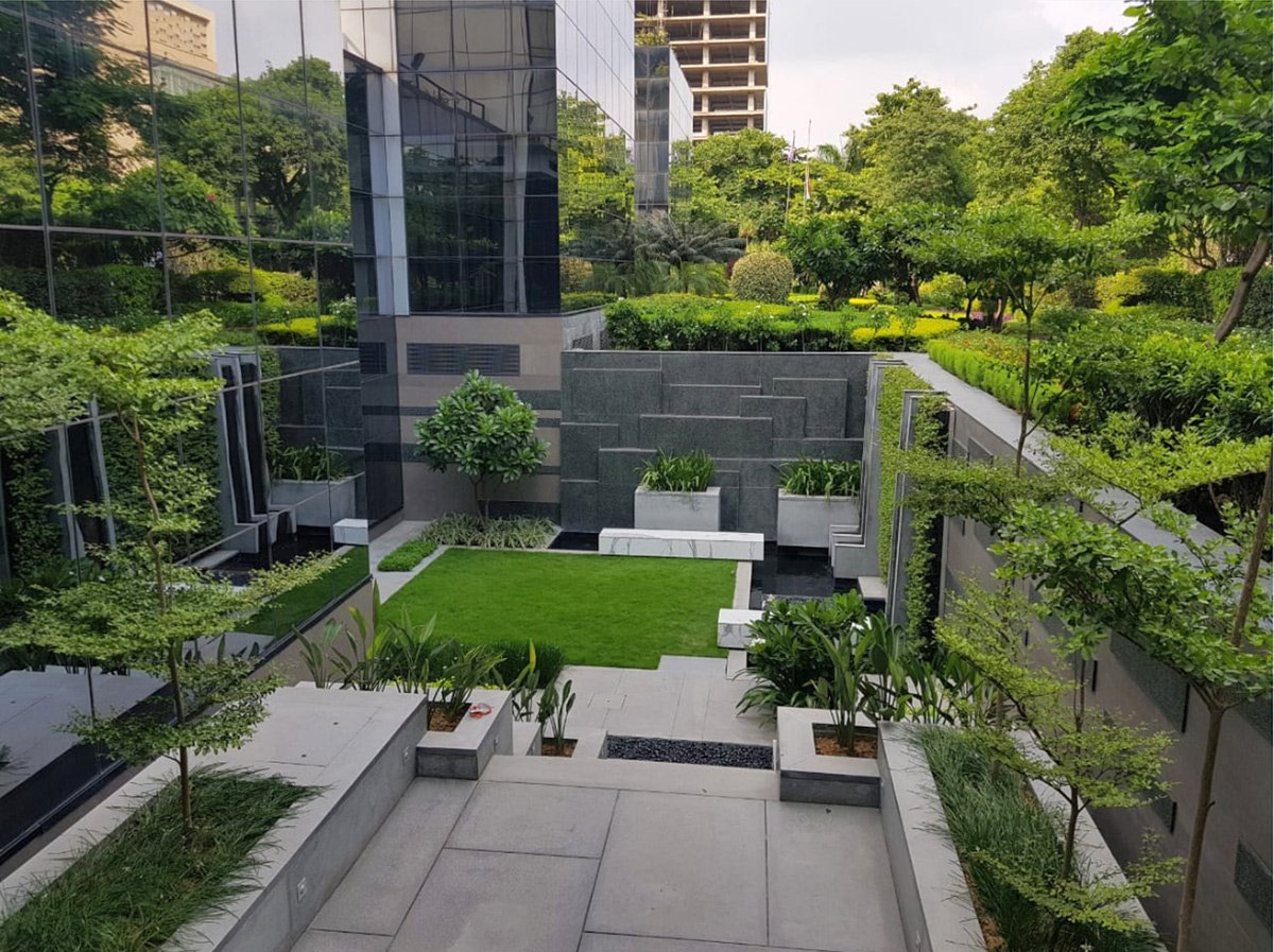 The dated appearance of this corporate head office required a significant overhaul of its external spaces, alongside the swanky interior renovations. The incidental spaces around the building wrap, the main drop-off court, the chairman's garden lookouts, and the sunken basement courtyards have been revitalized with contemporary landscape treatments. This transformation has converted the dull outdoor areas of the corporate environment into a trendy, international green setting.