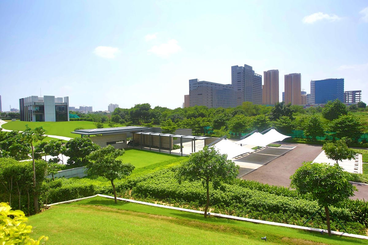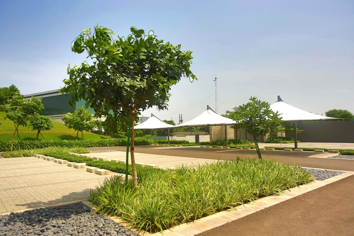 The site is located in Gurgaon, situated on an arid tract of land and a low lying zone characterised by poor soil quality and hot, dusty winds. The experience center has been designed as a green oasis within this challenging environment, employing a minimalistic approach with crisp detailing and a natural drainage system to sustain the garden.