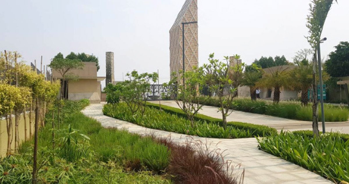 A unique aspect of this campus is its stormwater management system. The entire drainage is naturally integrated through bioswales along the length of the linear greens, channeling water to a sunken area that can hold excess water during the monsoon and also serve as a playground year-round. This is a one-of-a-kind design where 99 acres have been planned to sustain well without the need for a stormwater pipeline.