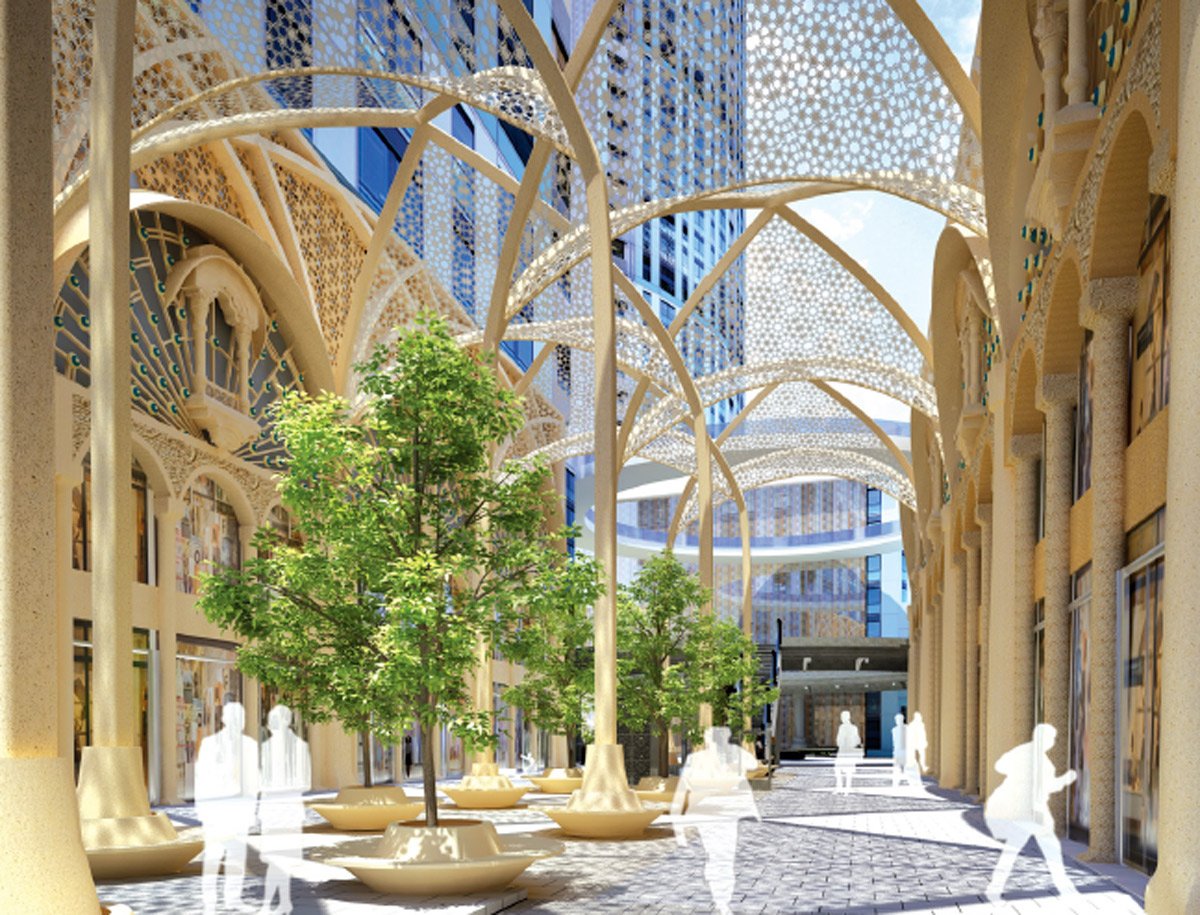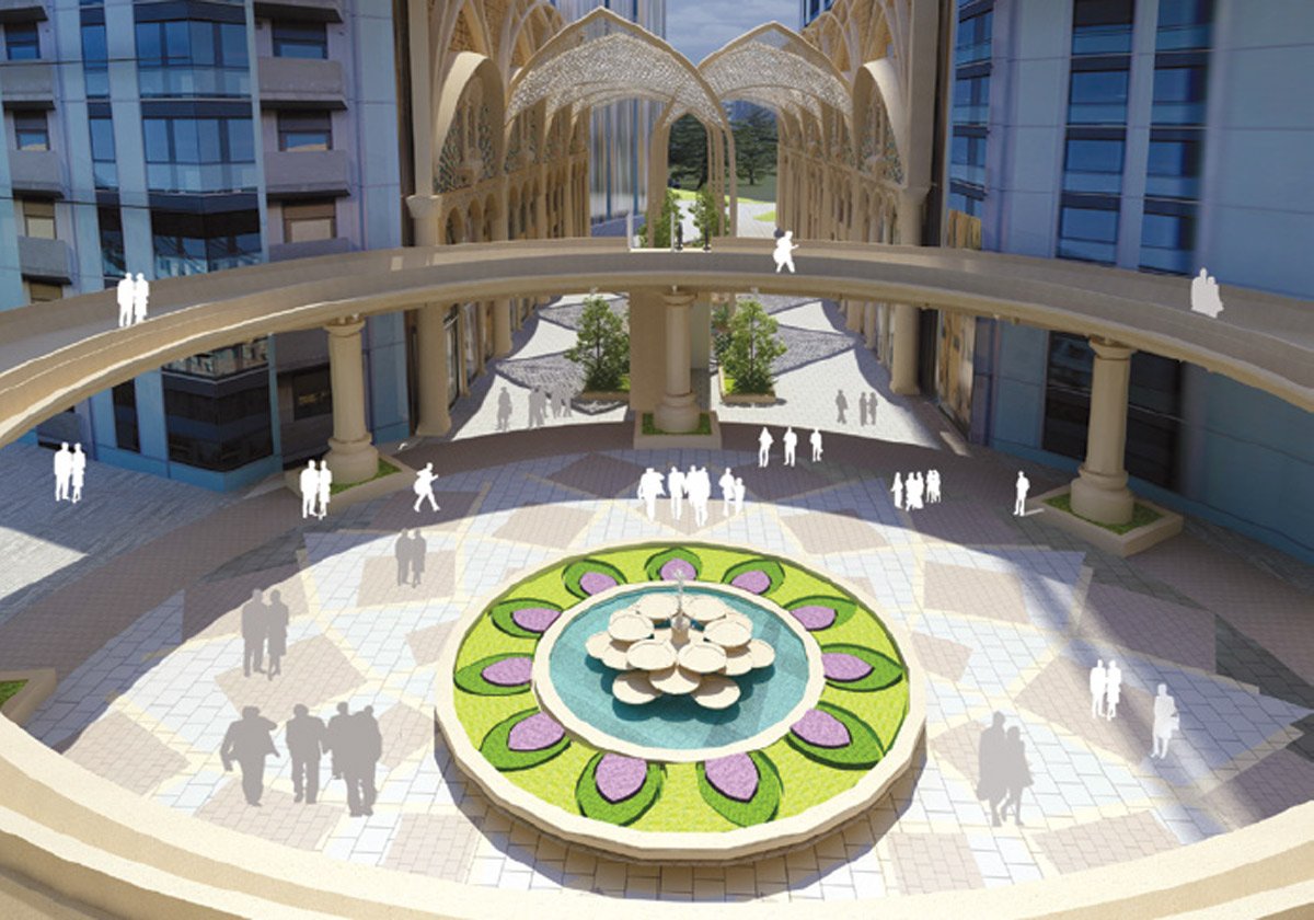 The essence of the lotus, symbolizing purity and divinity, is reflected in the geometry of the landscape. A grand recreation of an Indian palace walk captures the authenticity of royal Indian culture, while a double- height arcade framing the shopfronts, featuring a hierarchy of primary and secondary arches, adds an element of grandeur and magnificence. Intricate jaalis and jharokhas, with their detailed geometry, introduce another layer of regal charm while naturally filtering sunlight and wind, creating a comfortable and visually striking pedestrian experience.